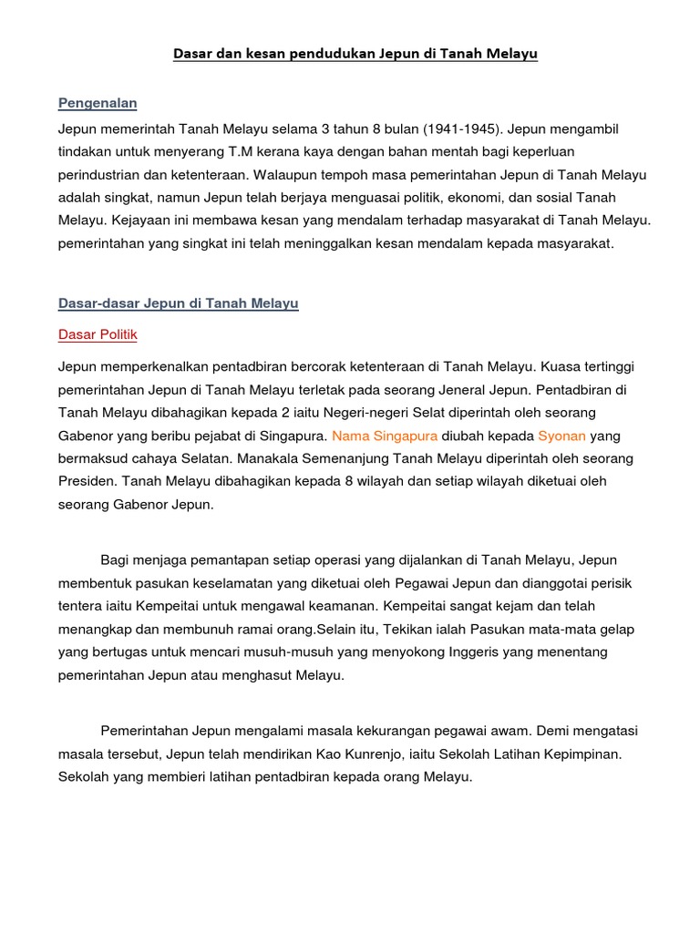 Kesan pendudukan jepun di tanah melayu essay. Keadaan ini memburukkan lagi ekonomi tanah melayu. Pendudukan jepun di negara kita. Kesan pendudukan jepun di tanah melayu (10m) 1. Tentera jepun berjaya kuasai tanah melayu dalam masa 10 minggu. Tanah melayu dikenali sebagai syonan (cahaya selatan) pada zaman pemerintahan jepun. Kesan kemaraan jepun di tanah melayu. Pendudukan jepun dan konflik kaum di tanah melayu: Pendudukan jepun di tanah melayu. Tentera jepun tidak memulihkan kemusnahan infrastruktur di tanah melayu. Walau bagaimanapun, pendudukan jepun yang telah membawa penderitaan itu telah meninggalkan kesan yang mendalam di kalangan semua penduduk. · orang melayu menyangka jepun akan memerintah tanah melayu lebih daripada british tetapi tanggapan mereka salah. Misalnya pihak jepun yang telah menjanjikan kemerdekaan kepada tanah melayu namun janji tersebut hanya tinggal janji sahaja.